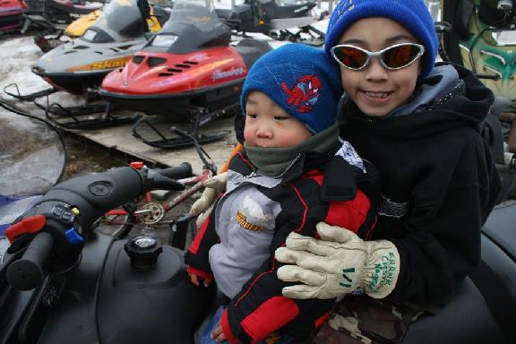1. Kaden Kignak, 1, future whaler, and Frank Nageak, 10, youngest member of the Akootchook Whaling Crew, play on the snow machine while the crew prepares for the ice.