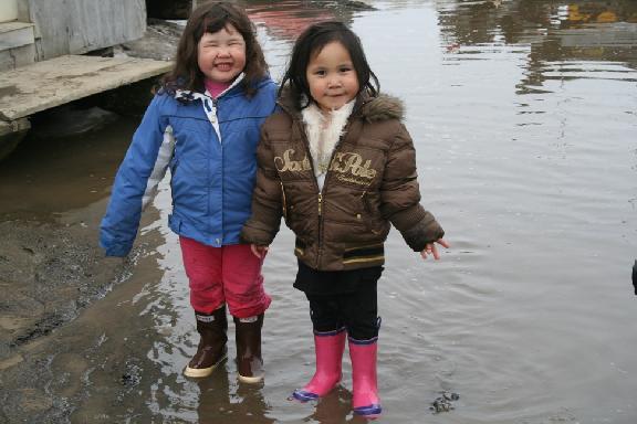 2. While everyone is preparing to head to the whaling camp on the ice, Carmen Kagak and Kivvaq Sage play in the puddle. Barrow experienced unusually warm weather for a week, resulting in a lot of melting snow.