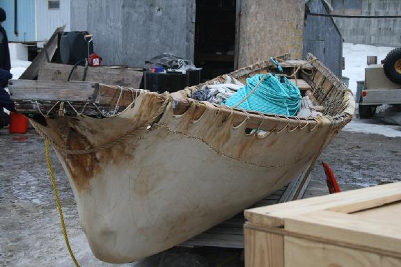 3. The umiaq, or seal skin boat, is loaded with the floats, paddles and harpoons needed for spring whaling.