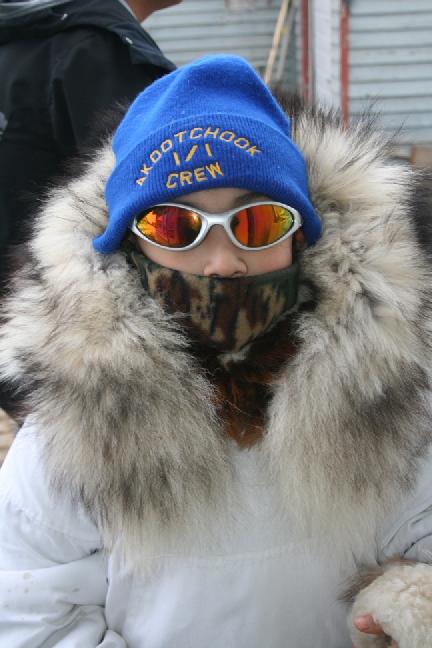 7. Frank Nageak, 10, is ready to go on the ice with the crew. He is the youngest member of the Akootchook Whaling Crew. The crew’s sign is the traditional marking for the Akootchook family and is shown on his hat: | / |