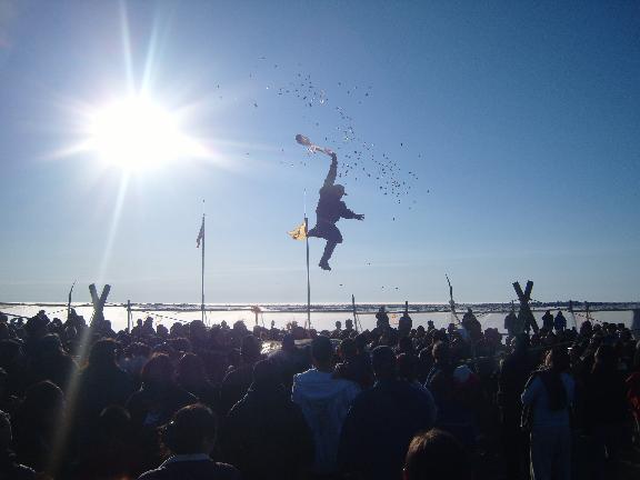 Jerony Patkotak of the Patkotak Whaling Crew celebrates a successful whaling season by jumping on the bearded seal skin blanket and tossing candy to the crowd. The Patkotak Whaling Crew and the Arnold Brower Crew held their nalukataq (spring whaling celebration) on Saturday, June 21 on the beach in Barrow, Alaska. The crews served the community all day long with items such as duck, geese or caribou soup, maktak (skin and fat of the bowhead whale), mikigaq (fermented maktak and meat), whale meat, and flipper. The feast was followed by a blanket toss and ended with Inupiaq dancing. The crew flags, as well as the frozen Arctic Ocean, can be seen in the background.