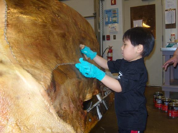 Here is a picture of my son Andrew Akootchook Sage. He is helping out our whaling crew, Akootchook Whaling Crew, by making sure the skin is properly oiled. He is rubbing a piece of seal fat over the skin boat so the skin doesn’t dry out while the others were fitting the cover to the boat frame. Andrew’s grandmother/aaka is local skin sewing expert Priscilla Sage.