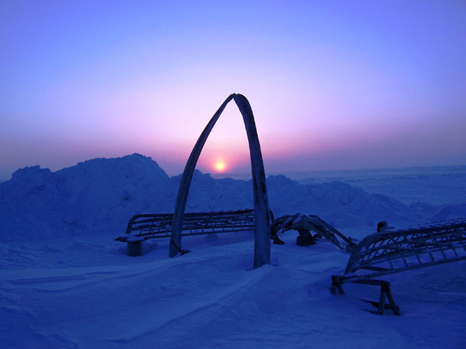 The evening sunset in Barrow at the famous whale bone arch - the Golden Arches.