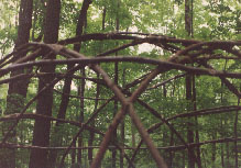 The completed sapling frame of my wigwam in the northeastern connecticut woods. The poles are made of sassafrass, the hoops are made of sweet birch. |