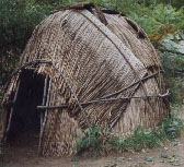 A smaller woman's wigwam (specially made for her moon time) at Plimoth Plantation covered with cattail mats. |
