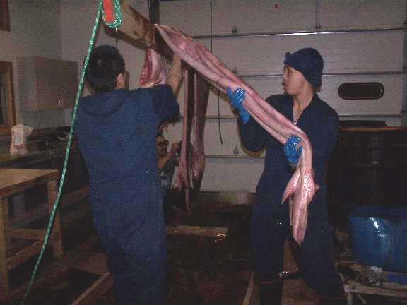 Here are some pictures of the Agvitchiaq Whaling Crew preparing the bearded seal skins for sewing. Bearded seals were harvested last summer, and the skins were rolled up with seal fat and fermented so the fur will slip easily. The bearded seal skins are placed underneath houses and stored in gunny sacks (remember our houses are all on pilings). The men scrape the fur off of the bearded seal skins and then the women carefully cut off the flippers. Usually the flippers are left on the skins until the actual day of sewing, but Roberta Leavitt and Thea Jennie Brower knew how to properly remove them. Fermented flippers are a delicacy, and the Agvitchiaq Crew members invited locals (via VHF) to come and help themselves to this delicious treat. Some of the fermented flippers will be saved for the next day, so the skin boat seamstresses can snack on the flippers while they sew all day long. This whaling crew has 12 skins, but will most likely not need all 12. Extras are on hand in case some skins have fermented too much or other problems.