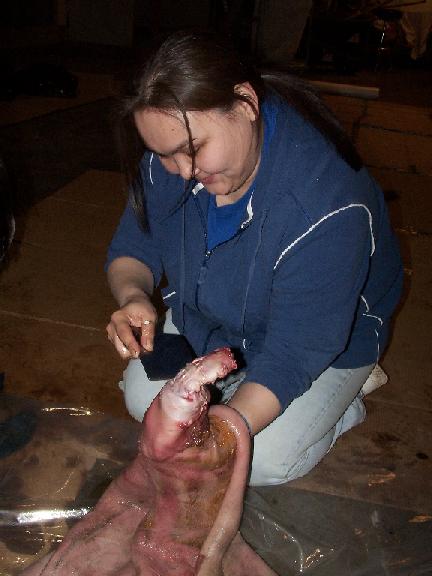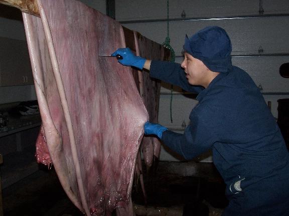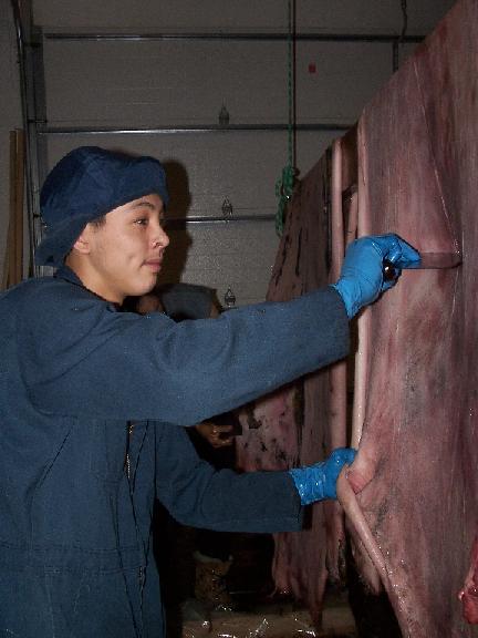 Thea Jennie Brower: Agvitchiaq Whaling Crew member Thea Jennie Brower carefully removes the flipper from the bearded seal skin, making sure not to cut through the skin.