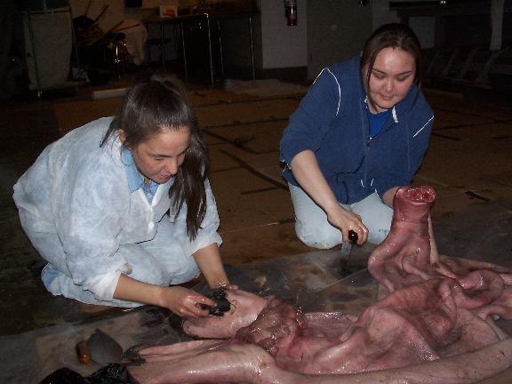 Roberta Leavitt and Thea Jennie Brower: Roberta Leavitt, wife of Agvitchiaq Whaling Crew's Captain Gilbert Leavitt, left, and Thea Jennie Brower, right, carefully remove the flippers from the fermented bearded seal skin. The flippers are a favored delicacy for the Inupiat, and this whaling crew invited locals to the Inupiat Heritage Center to take some home. Some of the fermented flippers will be saved for the next day for the seal skin boat seamstresses to enjoy.