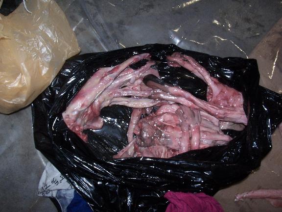 Delicacy - fermented flippers: Fermented flippers from bearded seals are a delicacy for the Inupiat. Here, several flippers carefully cut from the Agvitchiaq Whaling Crew's seal skins, are being offered to the community, especially the elders.